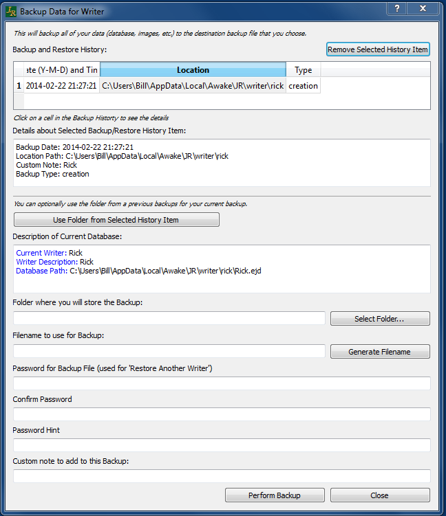 In addition to easily importing and exporting the journal and prompt data, you can use the backup and restore capabilities that copy the entire database to a location of your choosing, and then can restore from backup as desired. You can reference the history of your backup and restores at any time.