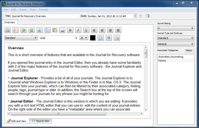 The Journal Editor gives you rich text editing functionality for editing your journal entries and associating metadata to the given journal entry. Metadata can be in the form of categories, journal type, rating, title and date of the journal entry.