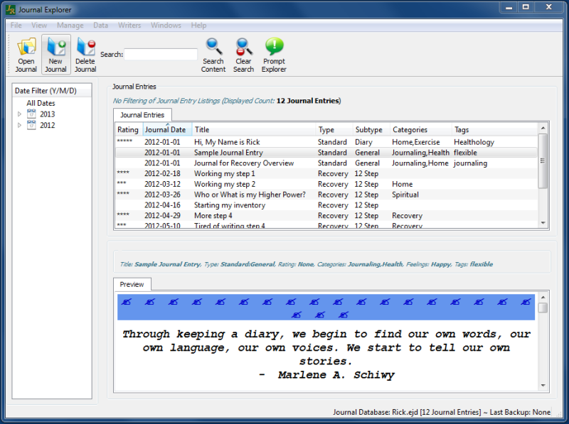 Of course creating, editing and managing journals are at the core of the Journal for Recovery software. This is accomplished primarily through the Journal Explorer and the Journal Editor.