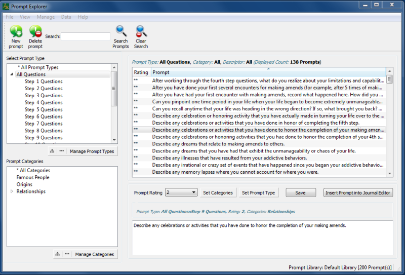 The Prompt Explorer organizes the questions, quotes, passages from books or other bits of text that you find inspiring and positive for your life. It is pre-populated with a list of questions, quotes and passages from books related to working a 12 Step program.